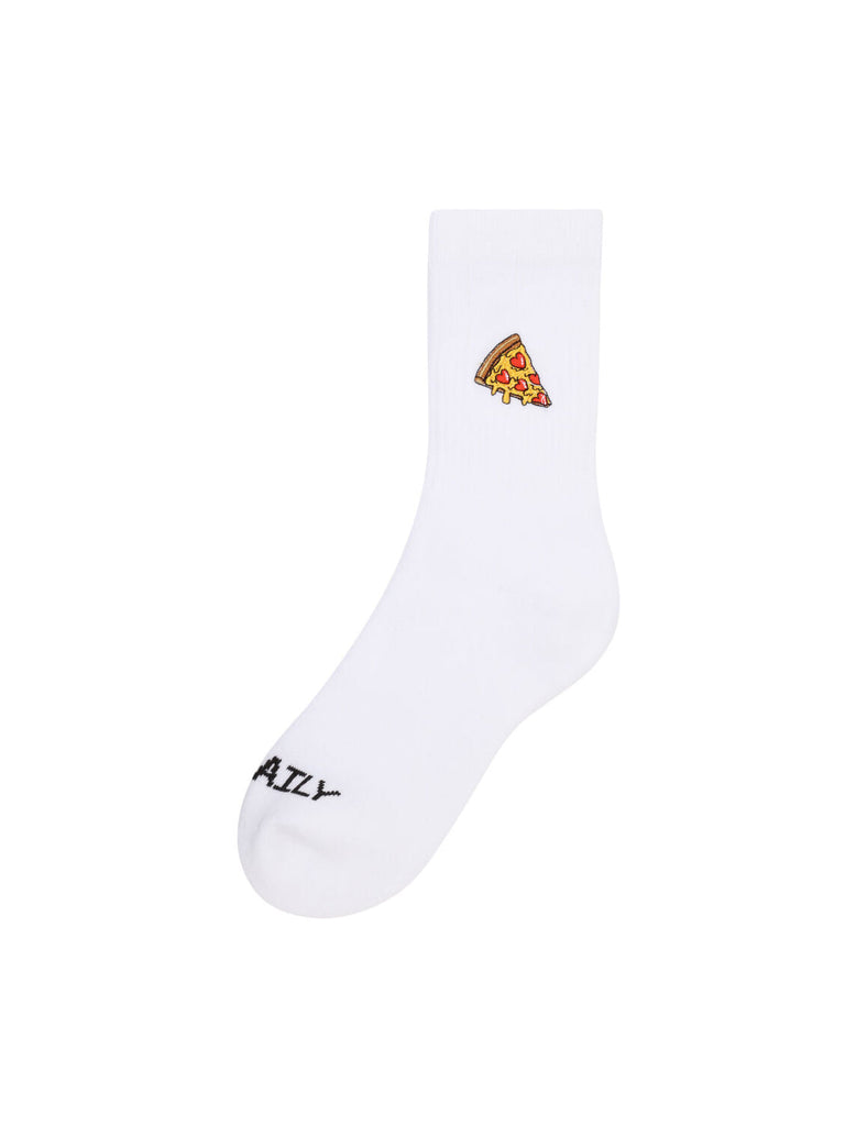 IrieDaily Pizza Love Socks - Mit den IRIEDAILY Pizza Love Socks trägst du eine umweltfreundliche und friedliche Message in die Welt, denn Fahrradfahren und Frieden könnten ziemlich viele Probleme in der Welt lösen. Die gestickte Artwork kommt auf dieser klassischen Sportsocke mit IRIEDAILY Schriftzug auf dem Spann. Die Artwork kommt übrigens von GoodMood und die veganen Socken wurden in Portugal hergestellt. Features: klassisch geschnittene Sportsocke, Intarsia Logo am Zehenteil, kleine Stickerei an der Außenseite, Artwork von Goodmood, hergestellt in Portugal, EU Größen: S/M=39-42, L/XL=43-46, vegan