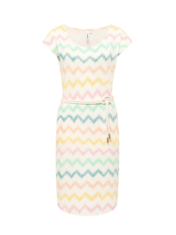 Ragwear Lilithe Print Dress - Gemustertes knielanges Sommerkleid von Ragwear mit einem geflochtenen Gürtel. Dieses Jerseykleid ist die perfekte Symbiose aus Eleganz und Bequemlichkeit für den Alltag. Mit seinem modernen Print-Muster steht das Kurzarmkleid für einen zeitgenössischen Style, der in jeder Freizeitgarderobe einen Platz findet. Es lässt sich sowohl lässig mit Sneakern als auch schick mit Sandaletten kombinieren und versprüht somit eine vielseitige Charme-Note. Das ausgewählte Material des Sommerkleides besticht durch seine super weiche Beschaffenheit, die jede Bewegung sanft mitmacht. Die ultraleichte und luftige Qualität des Stoffs macht es ideal für warme Tage und laue Abende. Mit seinem figurbetonenden Schnitt und seiner tollen Länge bis ca. zu den Knien passt sich dieses Damen Shirtkleid schmeichelhaft an die Silhouette an. Es endet etwa auf Mitte Oberschenkel und verfügt über kurze Ärmel sowie einen klassischen Rundhalsausschnitt, was es zum perfekten Kandidaten für sonnige Tage macht. Der geflochtene Gürtel in der Taille, gehalten durch schmale Gürtellaschen, betont die Taille und zaubert so eine tolle Figur. Ein Freizeitkleid, das sich hervorragend für diverse Anlässe kombinieren lässt - vom Strandspaziergang bis hin zum Stadtbummel. Features: Bequemes Kurzarm Kleid mit stylischem Alloverprint, Leichtes Sommerkleid aus angenehm elastischem Material, Figurumspielendes Minikleid mit top Länge bis zu den Knien, Shirtkleid mit rundem Ausschnitt und seitlichen Taschen, Super bequemes Sommerkleid mit viel Liebe zum Detail, Praktische, seitliche Eingrifftaschen, Maschinenwaschbar bei 30°C