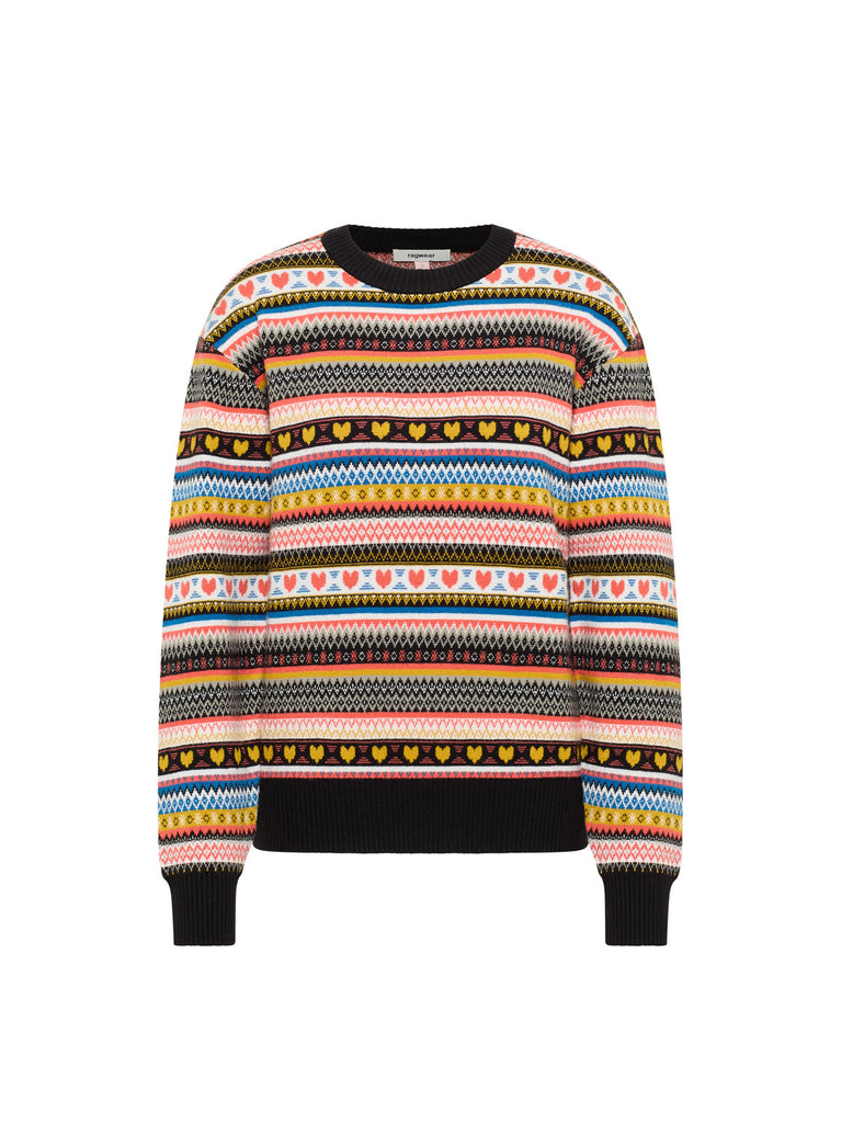 Ragwear Nordeena Stricksweat - Gemütlich, stylisch und perfekt für kalte Tage - der vegane Strickpullover NORDEENA von ragwear besticht durch sein verspieltes nordisches Muster. Das farbenfrohe Design bringt Abwechslung in deine Garderobe, während sich der weiche Strickstoff angenehm auf der Haut anfühlt. Die entspannte Passform und die breiten Rippbündchen an Ärmeln und Saum sorgen für maximalen Tragekomfort. Ob zu Jeans oder Chinos - dieser Pullover peppt jedes Outfit auf! Features: • Veganer Strickpullover mit verspieltem nordischen Muster, • Weicher Strickstoff aus Viskose, Polyester und Nylon, • Lockere Passform für ganztägigen Tragekomfort, • Breite Rippbündchen an Ärmeln und Saum, Fit: Gesamtlänge: 60 cm bei Größe S, Material: 50 % Viskose, 28 % Polyester, 22 % Nylon
