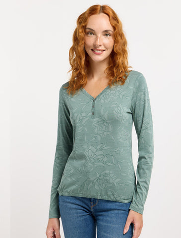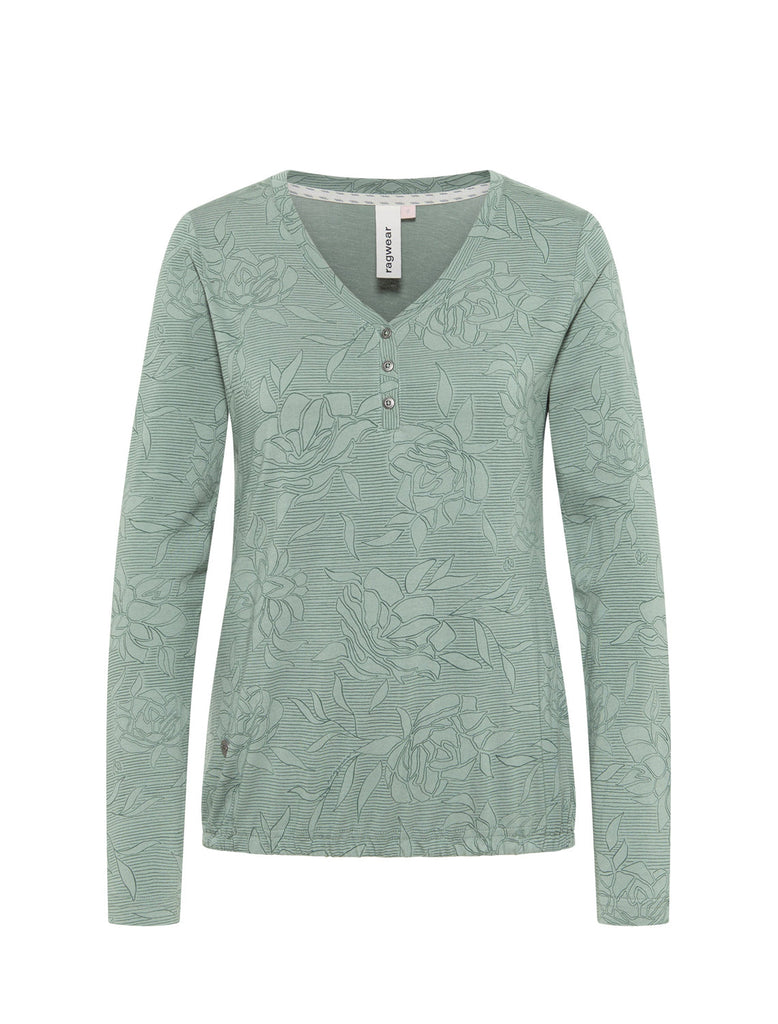 Ragwear Pinkki Print Longsleeve - Das vegane Langarmshirt PINKKI PRINT von ragwear überzeugt mit seinem femininen Look und hohem Tragekomfort. Das weiche Mischgewebe aus Baumwolle und Modal fühlt sich angenehm auf der Haut an, während der lockere Schnitt für ein entspanntes Tragegefühl sorgt. Ein dezentes Blumenmuster verleiht dem Shirt eine besondere Note, und der Gummizug am Saum garantiert eine bequeme Passform. Abgerundet wird das Design durch einen V-Ausschnitt mit zarter Knopfleiste - ein vielseitiges Lieblingsstück für jede Gelegenheit. Features: • Langarmshirt mit zartem Blumenprint, • Weiches Jersey-Material aus Baumwolle und Modal, • Lockerer Schnitt mit Gummizug am Saum, • V-Ausschnitt mit Knopfleiste, Passform: Gesamtlänge: 62 cm bei Größe S, Material: 50% Baumwolle, 50% Modal